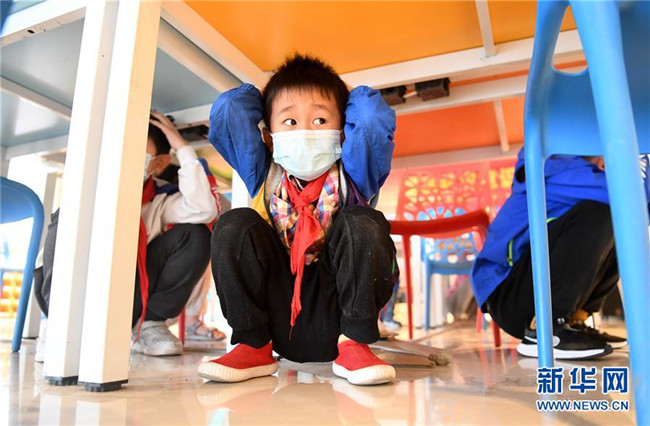 5月10日,合肥市淝南社區(qū)的兒童在進行地震防災應急避險演練。 新華社記者 劉軍喜 攝