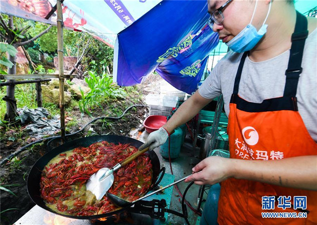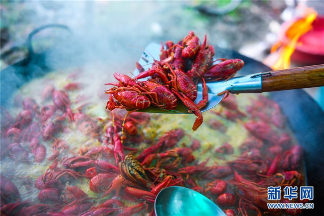 5月30日,廚師在龍蝦狂歡節(jié)現(xiàn)場烹制小龍蝦。新華社記者 徐昱 攝