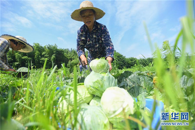 6月4日,在湘潭市雨湖區(qū)鶴嶺鎮(zhèn)龍安村,湘潭市仙女蔬菜產(chǎn)銷(xiāo)專(zhuān)業(yè)合作社的農(nóng)戶(hù)在田里采摘包菜。 新華社記者 陳澤國(guó) 攝