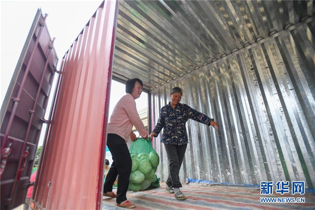 6月4日,在湘潭市雨湖區(qū)鶴嶺鎮(zhèn)龍安村,湘潭市仙女蔬菜產(chǎn)銷(xiāo)專(zhuān)業(yè)合作社的農(nóng)戶(hù)將采摘的包菜裝車(chē)。新華社記者 陳澤國(guó) 攝