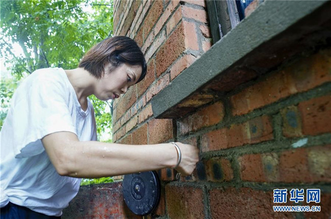 7月1日,地質災害監(jiān)測員侯芳對一處農房的墻上裂縫寬度進行測量。 新華社記者 劉潺 攝