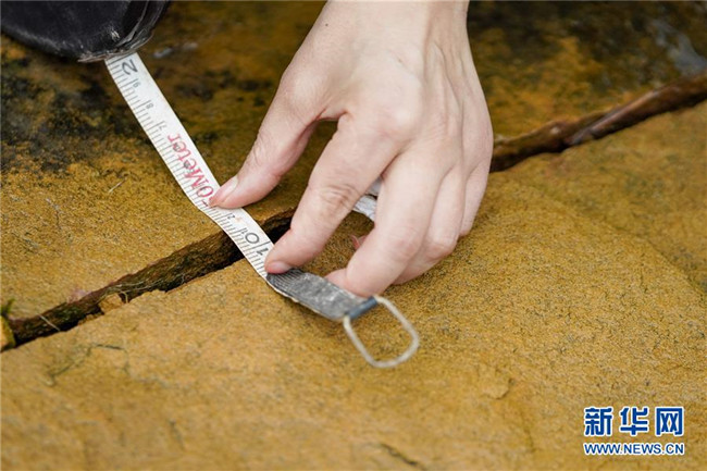 7月1日,地質災害監(jiān)測員侯芳在古家坳不穩(wěn)定斜坡地質災害點的一條裂縫前進行測量工作。新華社記者 劉潺 攝