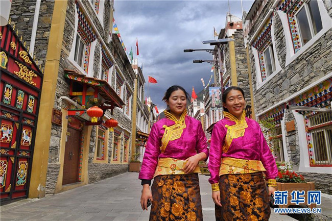 6月11日,同是經(jīng)營民宿客棧的四川省阿壩藏族羌族自治州理縣古爾溝鎮(zhèn)丘地村村民拉姆(左)和汪乃前往村口迎接客人。新華社記者 劉坤 攝