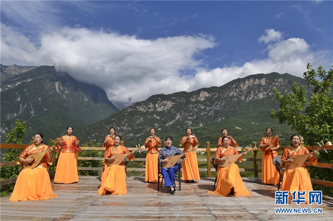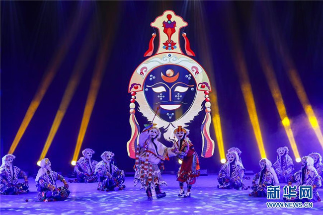 四川省阿壩藏族羌族自治州阿壩縣“蓮寶葉則”演藝公司演職人員在表演傳統(tǒng)曲種《折嘎》(6月14日攝)。折嘎是古老的曲種,如今被搬上舞臺,并在演唱中加入了傳遞吉祥、贊頌新人新事新風尚的內(nèi)容。這些演職人員中不少是從當?shù)剜l(xiāng)村里來的年輕人,經(jīng)過培訓合格后成為演員,通過表演獲得穩(wěn)定的收入。新華社記者 沈伯韓 攝