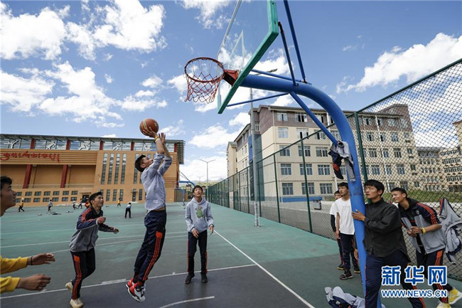 在四川省阿壩藏族羌族自治州阿壩縣藏文中學新的籃球場上,初中二年級男生在體育課上打籃球(6月14日攝),周圍則是新的教學樓和體育運動場館。新華社記者 沈伯韓 攝