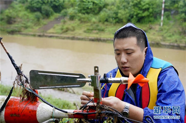 7月1日,在永川區(qū)臨江河來蘇水文站,站長(zhǎng)鐘睿在安裝調(diào)試流速儀。新華社記者 劉潺 攝