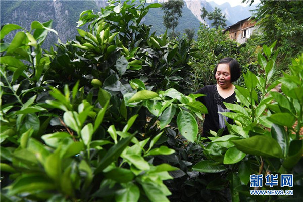 7月3日,63歲的下莊村村民劉崇英在查看柑橘的生長(zhǎng)情況。新華社記者王全超攝