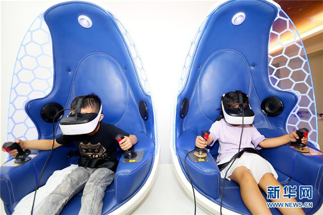 7月12日,小學(xué)生在山東省青島市即墨區(qū)環(huán)秀街道濱湖社區(qū)科普館進行VR體驗活動。新華社發(fā)(梁孝鵬 攝)