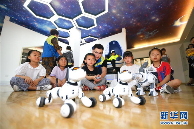 7月12日,小學(xué)生在山東省青島市即墨區(qū)環(huán)秀街道濱湖社區(qū)科普館與機器人互動。新華社發(fā)(梁孝鵬 攝)