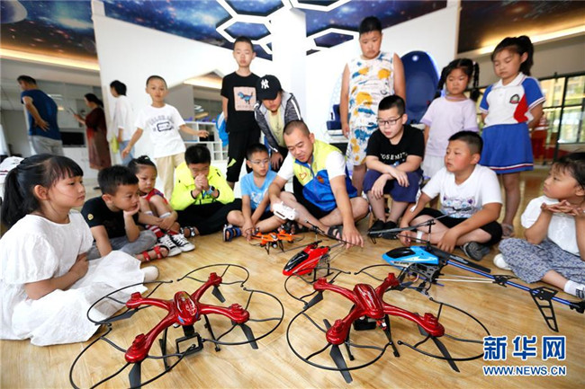 7月12日,山東省青島市即墨區(qū)環(huán)秀街道濱湖社區(qū)科普館工作人員在給小學(xué)生講解無人機飛行常識。新華社發(fā)(梁孝鵬 攝)