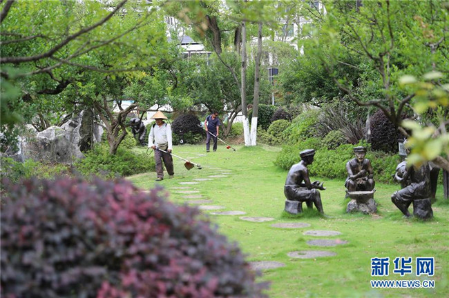 7月19日,在貴州省銅仁市玉屏侗族自治縣田坪鎮(zhèn)侗鄉(xiāng)風(fēng)情園內(nèi),易地扶貧搬遷群眾在清掃環(huán)境衛(wèi)生。新華社發(fā)(胡攀學(xué) 攝)