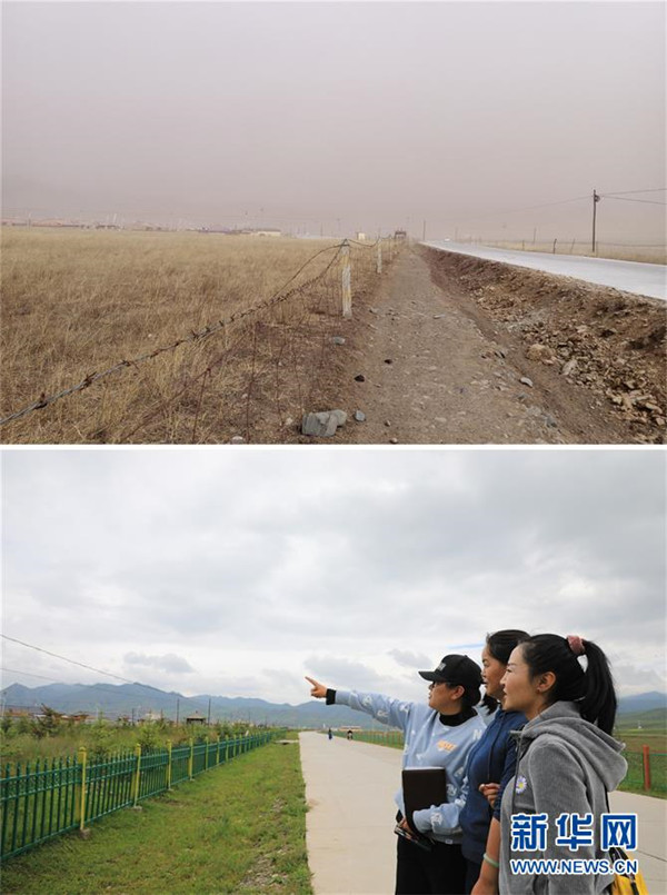 拼版照片:上圖為崗岔村村道綠化改造前的面貌(資料照片)。下圖為7月23日,卓瑪吉(右一)和駐村幫扶工作隊(duì)隊(duì)員站在綠化改造后的崗岔村村道上,謀劃下一步的工作。新華社發(fā)(杜哲宇攝)崗岔村是甘肅省甘南藏族自治州夏河縣桑科鎮(zhèn)的一個(gè)牧業(yè)村,平均海拔3000米以上。2018年,在夏河縣文明辦工作的卓瑪吉開始擔(dān)任駐村幫扶工作隊(duì)隊(duì)長(zhǎng),每年都有200多天待在草原上。兩年來(lái),卓瑪吉帶領(lǐng)大家開辦扶貧車間,發(fā)展特色產(chǎn)業(yè),聯(lián)系勞務(wù)輸出。為了讓村民更全面地了解精準(zhǔn)扶貧政策,卓瑪吉登門宣講政策。為了提高村容村貌,卓瑪吉發(fā)動(dòng)大家開展廁所革命和庭院環(huán)境評(píng)比,積極響應(yīng)甘南藏族自治州“全域無(wú)垃圾”創(chuàng)建行動(dòng)。她還從縣城請(qǐng)來(lái)醫(yī)生,為村民舉辦健康講座,在全村婦女中開展“兩癌篩查”。如今,崗岔村變成了干凈、整齊、富裕、美麗的生態(tài)文明村,提前實(shí)現(xiàn)了整村脫貧。談起心愿,卓瑪吉說(shuō):“要讓草原和草原上的人都變得更美。”新華社發(fā)