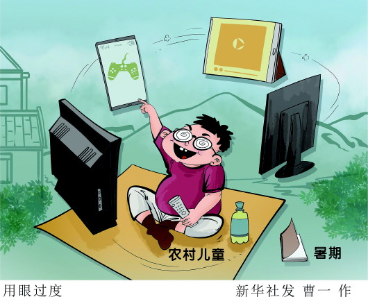 記者走訪發(fā)現(xiàn),暑期用眼過度的現(xiàn)象在不少農(nóng)村兒童中存在。有孩子跟著電視臺追劇,一看就是一整天;有家長晨起上廁所,竟發(fā)現(xiàn)孩子“刷了一夜手機”;一位媽媽“吐槽”說,為了讓孩子少看電子產(chǎn)品,每天都要“斗智斗勇”:改密碼、藏充電線、沒收手機……