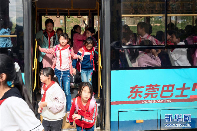 如今,李本艷姐弟倆從卯家灣家門(mén)口坐上東莞愛(ài)心巴士,25分鐘就可到學(xué)校(攝于7月3日)。新華網(wǎng)發(fā)(鮑禹 攝)