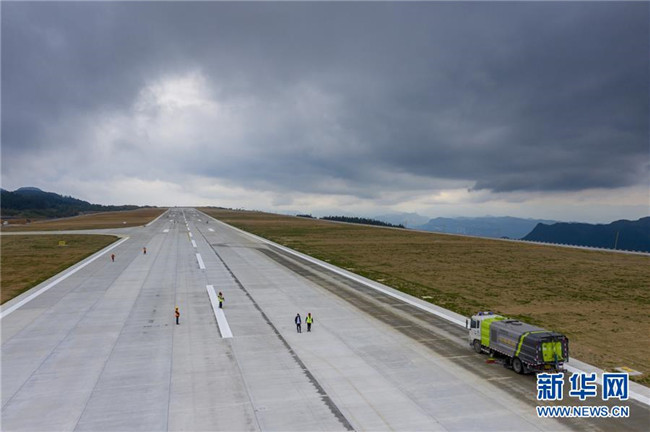 8月12日,校飛正式開始前一天,工作人員對仙女山機場跑道路面進行清潔(無人機照片)。新華社記者 劉潺 攝