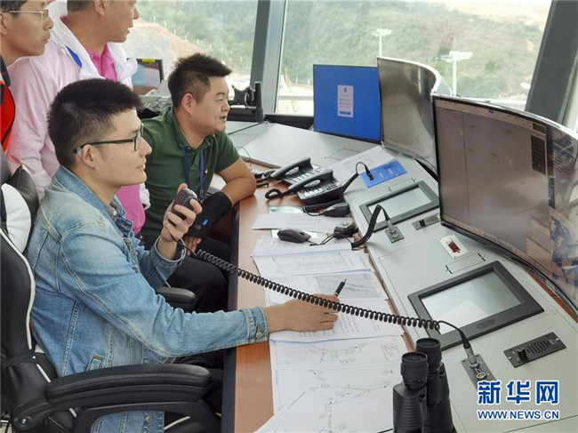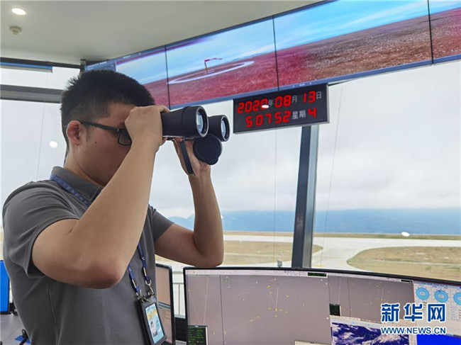 8月13日,參加校飛的地面工作人員在仙女山機場的塔臺工作區(qū)內(nèi)工作。 新華社記者 劉潺 攝