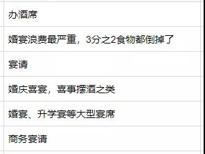 在調(diào)查問(wèn)卷的后臺(tái)留言中,不少受訪者留言說(shuō),同學(xué)會(huì)、紅白宴、生日宴、升學(xué)宴、商務(wù)宴請(qǐng)等浪費(fèi)量較高,甚至有人說(shuō)“三分之二的食物都倒掉了”。