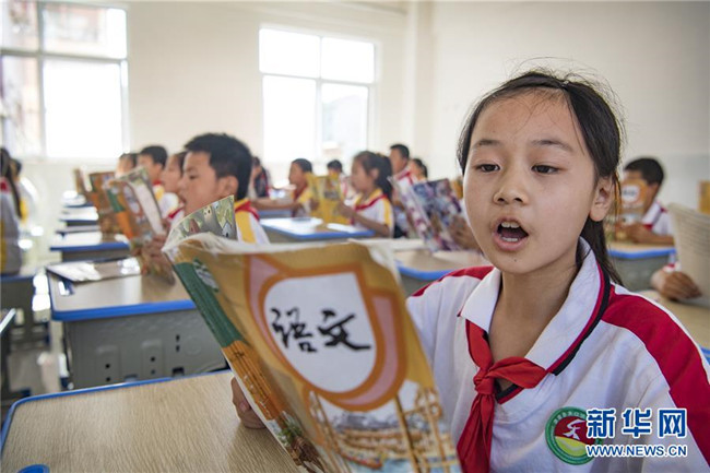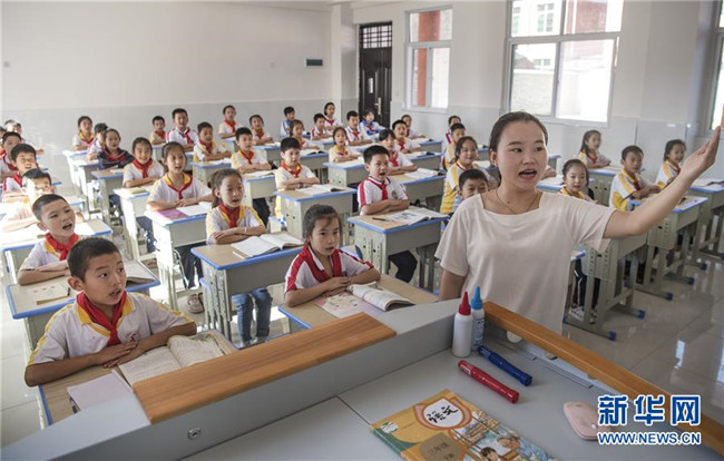 8月25日,靈口鎮(zhèn)中心小學(xué)的孩子們在新落成的標(biāo)準(zhǔn)化教室里體驗(yàn)第一堂課。新華社記者陶明攝