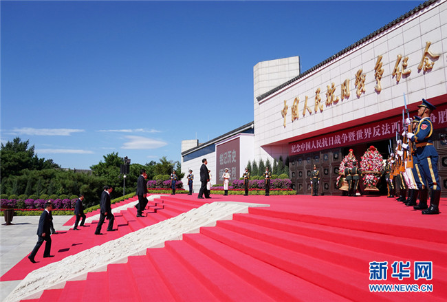 9月3日上午,習(xí)近平、李克強(qiáng)、栗戰(zhàn)書、汪洋、王滬寧、趙樂際、韓正、王岐山等黨和國家領(lǐng)導(dǎo)人來到中國人民抗日戰(zhàn)爭紀(jì)念館,出席紀(jì)念中國人民抗日戰(zhàn)爭暨世界反法西斯戰(zhàn)爭勝利75周年向抗戰(zhàn)烈士敬獻(xiàn)花籃儀式。 新華社記者 王曄 攝