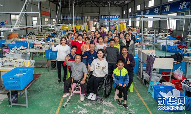 10月13日,在湖南省邵陽市城步縣湖南七七科技股份有限公司生產(chǎn)車間,殘疾女青年楊淑亭(前排中)與工友合影。1991年出生的苗族姑娘楊淑亭因車禍胸部以下高位截癱,通過不斷學(xué)習(xí)摸索,開辦網(wǎng)店并注冊(cè)了自己的企業(yè),與周邊貧困家庭簽訂合作協(xié)議,制作售賣具有民族特色的背包和仿真花卉,帶動(dòng)上千名貧困人員及59名殘疾人就業(yè)。