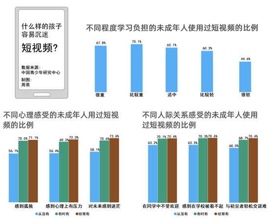 調(diào)查同時(shí)發(fā)現(xiàn),感到孤獨(dú)、心理上有壓力、對(duì)未來迷惘的中小學(xué)生接觸短視頻的比例更高。