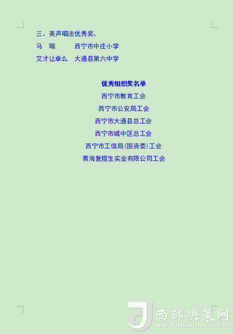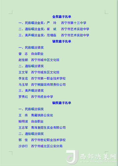 本次比賽旨在通過歌手們的激情演繹,增強(qiáng)全市廣大職工群眾的獲得感、幸福感、安全感,展現(xiàn)西寧市職工群眾的時(shí)代風(fēng)貌,進(jìn)一步營造弘揚(yáng)勞模精神、勞動(dòng)精神、工匠精神的濃厚氛圍,為更高水平打造綠色發(fā)展樣板城市建設(shè)新時(shí)代幸福西寧增強(qiáng)信心、凝聚力量。(后附獲獎(jiǎng)名單)。