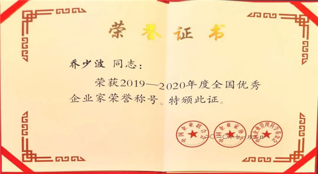 12月1日,以“弘揚(yáng)優(yōu)秀企業(yè)家精神,勇于創(chuàng)新?lián)?dāng)奉獻(xiàn)”為主題的“2020年全國企業(yè)家活動(dòng)日暨中國企業(yè)家年會(huì)”在廣東省東莞市舉行。會(huì)上表彰了154名優(yōu)秀企業(yè)家,公司董事長、總經(jīng)理喬少波喜獲“2019-2020年全國優(yōu)秀企業(yè)家”稱號(hào)。