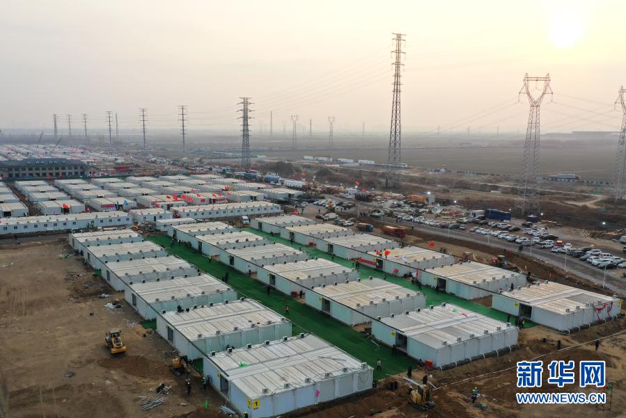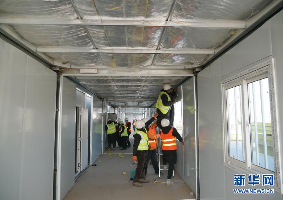 1月18日,在河北省石家莊市黃莊公寓隔離場所項目工地,工人在安裝集成房屋。新華社記者 楊世堯 攝
