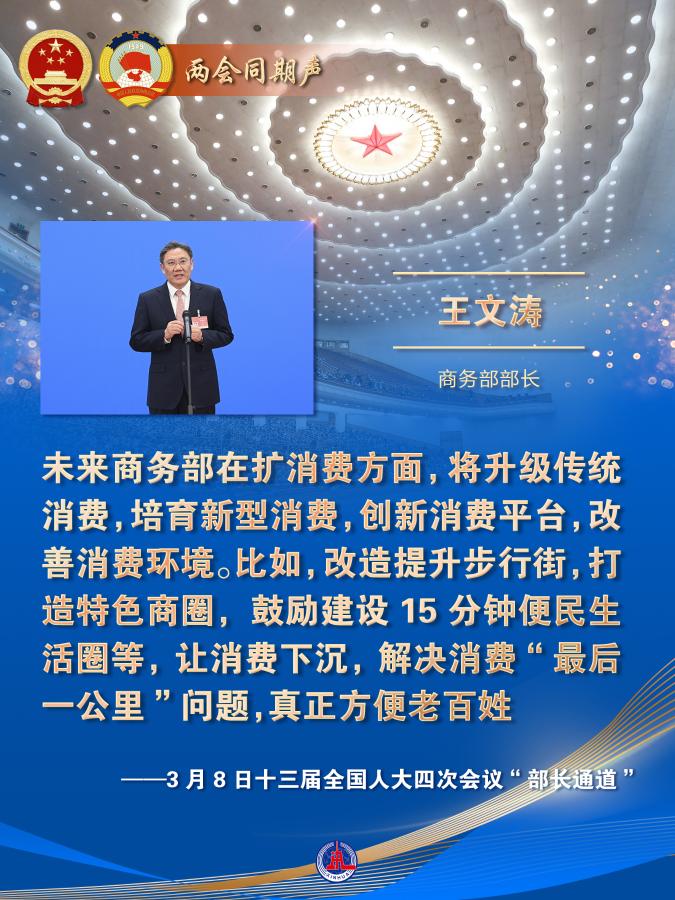 新的一年,消費表現會如何?我國在擴大開放方面將邁出哪些新步伐?8日舉行的全國兩會“部長通道”上,商務部部長王文濤回應了商務領域熱點問題。