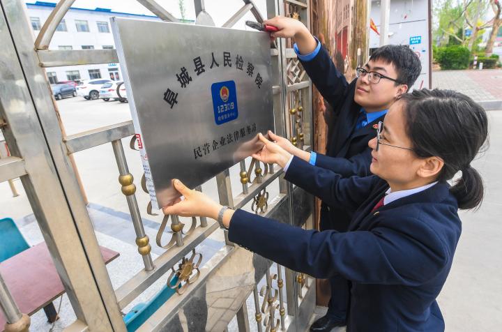 2019年4月23日,河北省阜城縣人民檢察院檢察官在一家企業(yè)門口掛“民營企業(yè)法律服務(wù)站”的牌子,為經(jīng)濟發(fā)展履行保駕護航職責(zé)。新華社記者李曉果攝