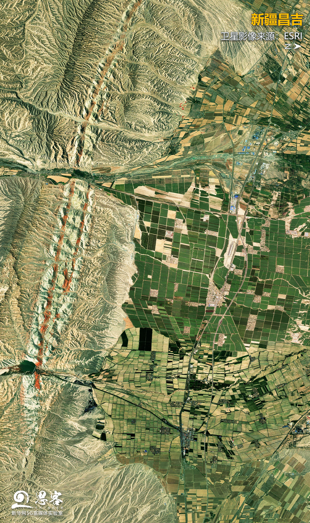 綠色的農(nóng)田與天山丹霞相映生輝