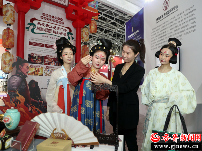 在第五屆絲博會(huì)陜文投集團(tuán)展區(qū),身著漢服的工作人員向觀(guān)眾介紹文創(chuàng)產(chǎn)品。 記者 杜靜波 攝