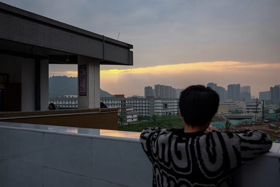 4月8日傍晚,天際出現(xiàn)了一道晚霞,我的一名學(xué)生在走廊里向遠(yuǎn)處看去。