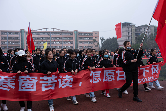 3月9日,高考誓師大會現(xiàn)場,我們班的學(xué)生舉著橫幅和班旗,列隊(duì)準(zhǔn)備走過主席臺。橫幅上寫著“同是寒窗苦讀,怎愿甘拜下風(fēng)”。
