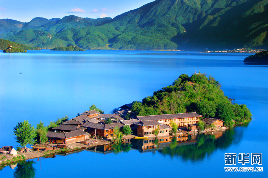 里格半島在藍(lán)天碧水的映襯下更加美麗動(dòng)人。新華網(wǎng)發(fā)(麗江瀘沽湖管理局供圖)