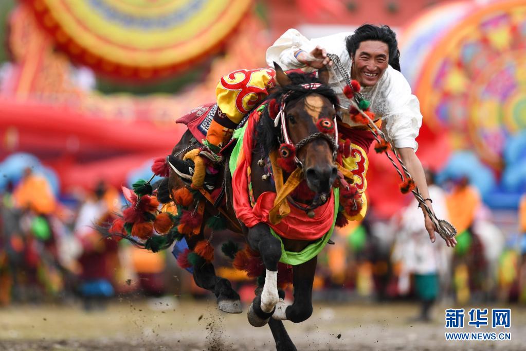 8月4日,當(dāng)?shù)厝罕娫谟駱?shù)藏族自治州成立70周年慶祝大會(huì)上表演傳統(tǒng)賽馬。新華社記者 吳剛 攝