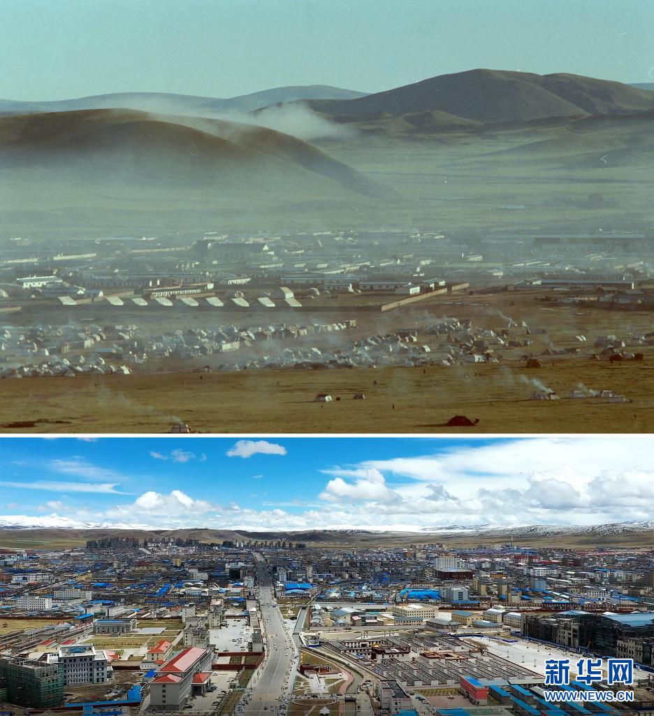 拼版照片:上圖是20世紀(jì)80年代的西藏那曲地區(qū)行署所在地那曲鎮(zhèn)(新華社記者袁克忠攝);下圖是那曲市市區(qū)風(fēng)貌(新華社發(fā) 普布扎西攝,無人機(jī)視頻截圖)。新華社發(fā)
