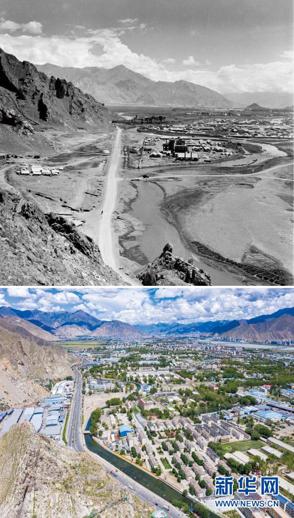 拼版照片:上圖是20世紀(jì)60年代拍攝的拉薩市西郊景象(新華社發(fā) 藍(lán)志貴攝);下圖是2021年8月9日拍攝的拉薩市西郊新貌(新華社記者普布扎西攝,無人機(jī)照片)。新華社發(fā)