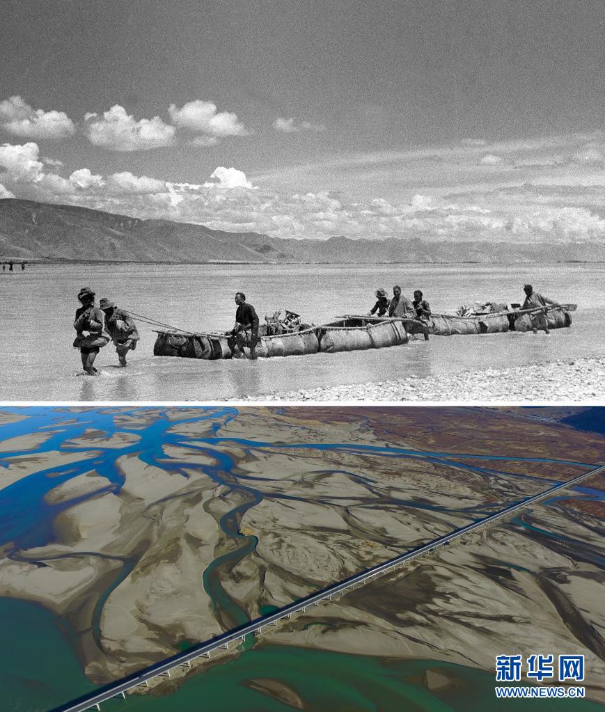 拼版照片:上圖是20世紀(jì)50年代,雅魯藏布江上游的牛皮船載著土特產(chǎn)和糧食沿江運(yùn)輸至西藏東部(新華社發(fā) 趙奇攝);下圖是2016年12月11日拍攝的位于西藏山南市扎囊縣境內(nèi)的扎囊特大橋(新華社記者普布扎西攝)。新華社發(fā)