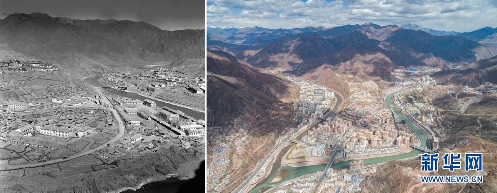 拼版照片:左圖是20世紀(jì)60年代的昌都市區(qū)一角(新華社記者任用昭攝);右圖是2021年3月25日拍攝的昌都市卡若區(qū)(新華社記者孫非攝,無人機(jī)照片)。新華社發(fā)