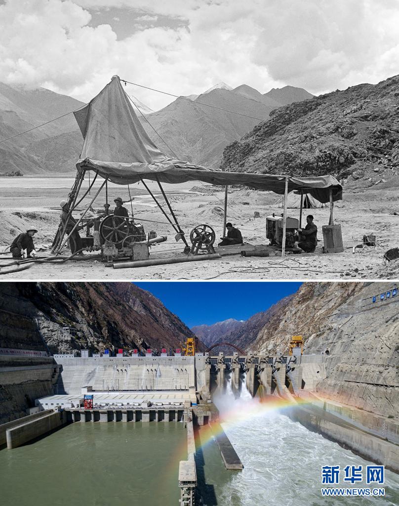 拼版照片:上圖是20世紀(jì)50年代,西藏工程勘察隊(duì)鉆探組在選定的拉薩水力發(fā)電廠廠址,用從東北雞西礦務(wù)局機(jī)械總廠運(yùn)來的鉆探機(jī)進(jìn)行鉆探(新華社記者任用昭攝);下圖是2018年10月26日拍攝的西藏首座大型水電站——藏木水電站(新華社發(fā) 董志雄攝)。新華社發(fā)