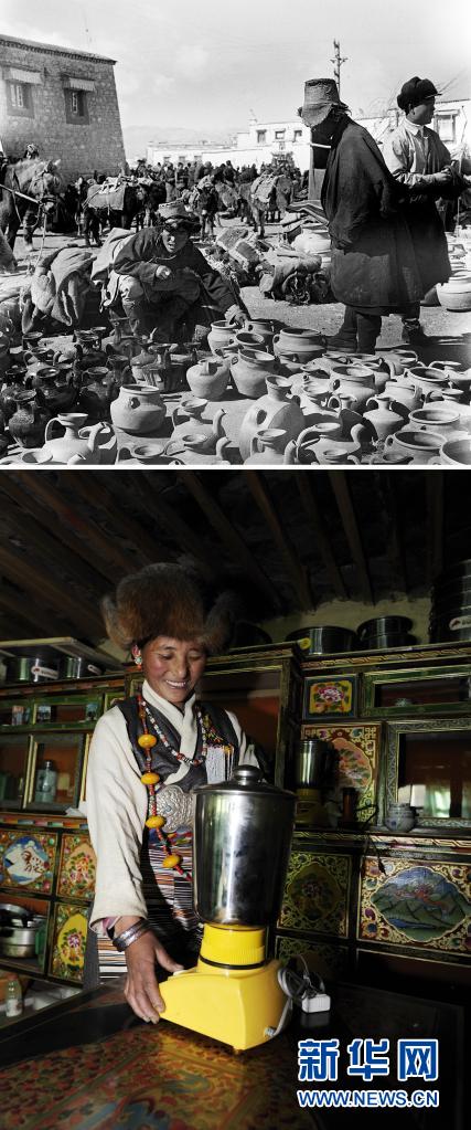 拼版照片:上圖是20世紀(jì)50年代,拉薩居民購買酥油茶壺(新華社記者任用昭攝);下圖是2011年12月12日,西藏日喀則拉孜縣吉角村村民倉決用電動酥油茶攪拌機(jī)給家人打酥油茶(新華社記者普布扎西攝)。新華社發(fā)