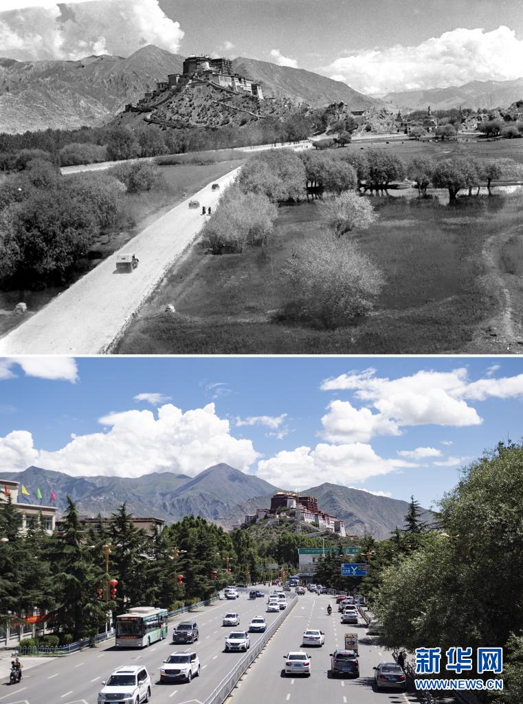 拼版照片:上圖是20世紀(jì)50年代,汽車通過市郊公路開往布達(dá)拉宮方向(新華社記者任用昭攝);下圖是2021年8月9日,車輛穿行在通往布達(dá)拉宮的大路上(新華社記者張汝鋒攝)。新華社發(fā)