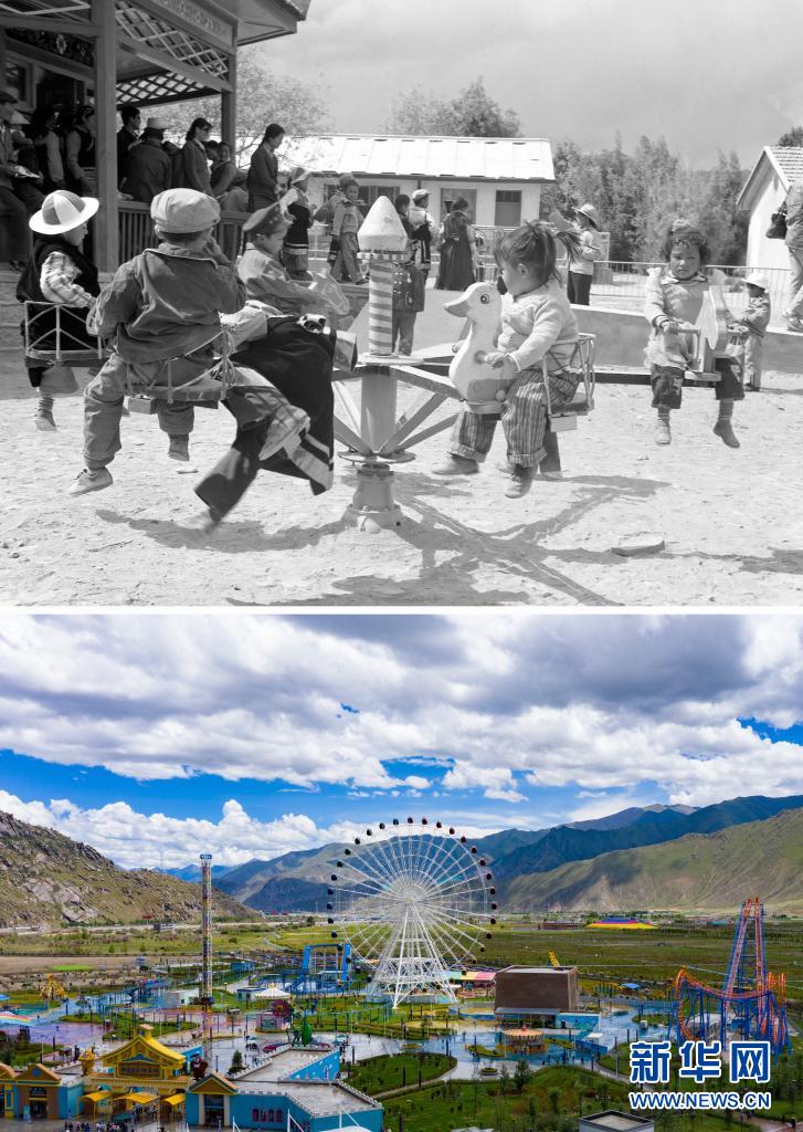 拼版照片:上圖是20世紀(jì)80年代,日喀則幼兒園的孩子們在玩動物圓盤轉(zhuǎn)椅(新華社記者程曦?cái)z);下圖是2021年8月9日拍攝的拉薩市象雄美朵游樂園(新華社記者張汝鋒攝,無人機(jī)照片)。新華社發(fā)