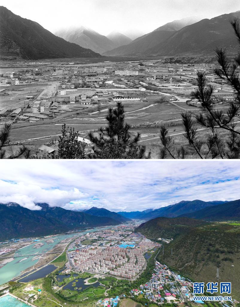 拼版照片:上圖是20世紀(jì)70年代的西藏山南地區(qū)澤當(dāng)鎮(zhèn)景象(新華社記者顧綬康攝);下圖是2020年11月26日拍攝的山南澤當(dāng)鎮(zhèn)風(fēng)貌(新華社發(fā) 次仁龍布攝,無人機(jī)照片)。新華社發(fā)