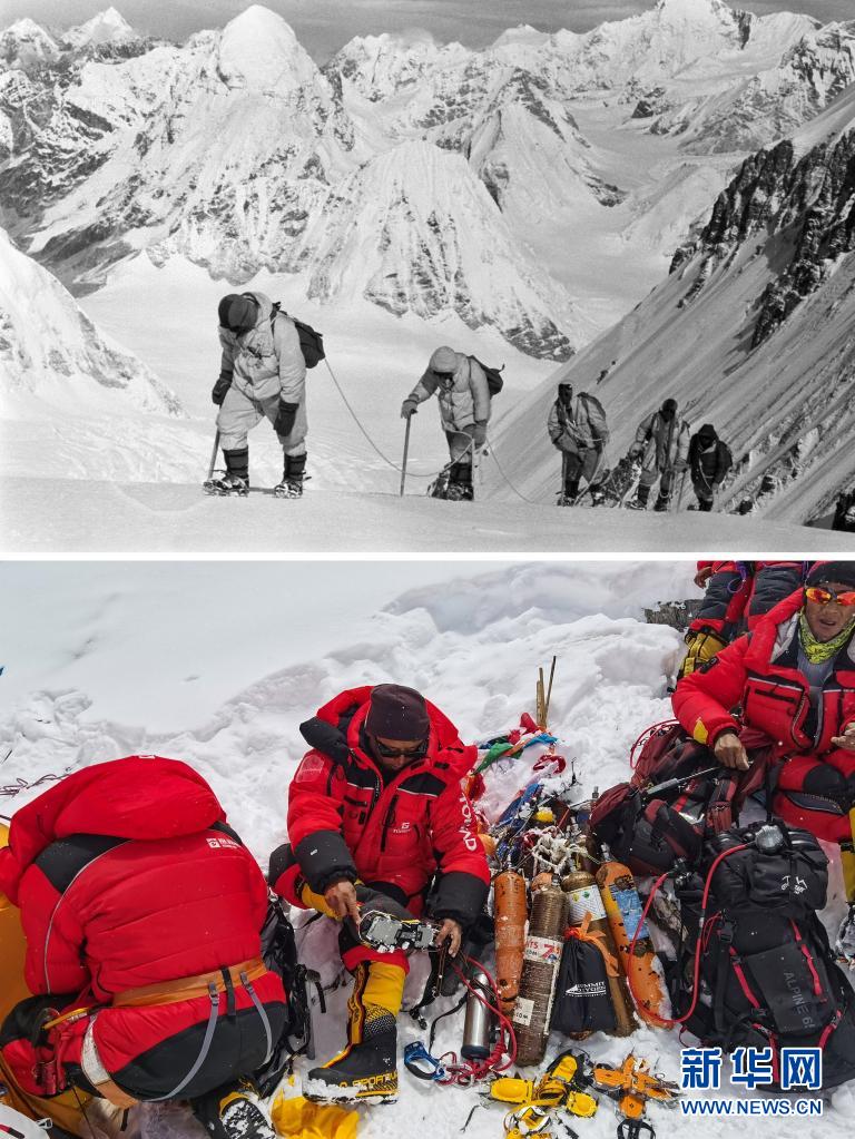 拼版照片:上圖是1960年,登山隊(duì)隊(duì)員在海拔7000米以上的雪坡上前進(jìn)(資料照片);下圖是2020年5月21日拍攝的2020珠峰高程測量登山隊(duì)員所使用的現(xiàn)代登山設(shè)備(新華社特約記者拉巴攝)。新華社發(fā)