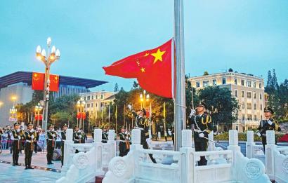 “向國旗——敬禮!”隨著國旗護(hù)衛(wèi)隊(duì)領(lǐng)隊(duì)發(fā)出響亮的口令,護(hù)旗隊(duì)員行舉槍禮。