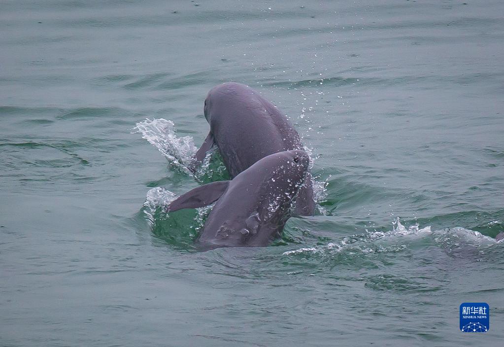5月10日,在湖北省宜昌市江邊,長(zhǎng)江江豚在水中嬉戲。新華社記者 肖藝九 攝
