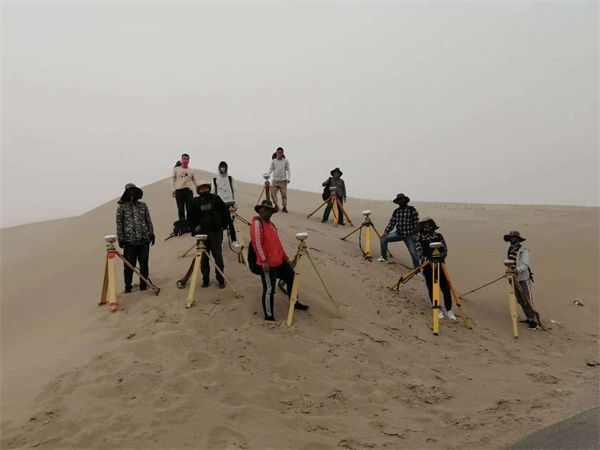 后來,唐飛帶領團隊又前往新疆若羌,為中鐵一局三公司和若鐵路項目進行前期控制網(wǎng)復測。項目線路長、地廣人稀,且地處塔克拉瑪干沙漠邊緣。為了節(jié)省時間,每天早上他和隊員背著馕、咸菜、礦泉水出發(fā),在沙漠戈壁一測就是十二個小時,晚上八九點左右才能回去吃口熱飯。有一次,他們在工地上測量時,突遇沙塵暴,他和三個組員趕快收拾儀器,裝進儀器箱,四個人圍在一起,等著沙塵暴過去。
