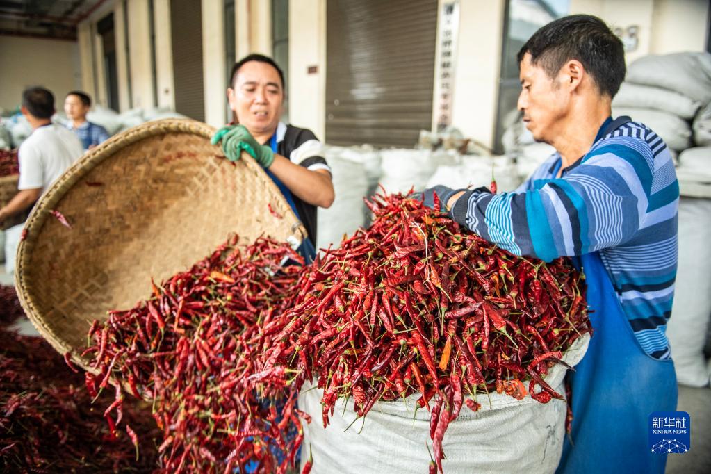 經(jīng)銷商在遵義市新蒲新區(qū)中國辣椒城挑選辣椒(2020年8月18日攝)。新華社記者 陶亮 攝